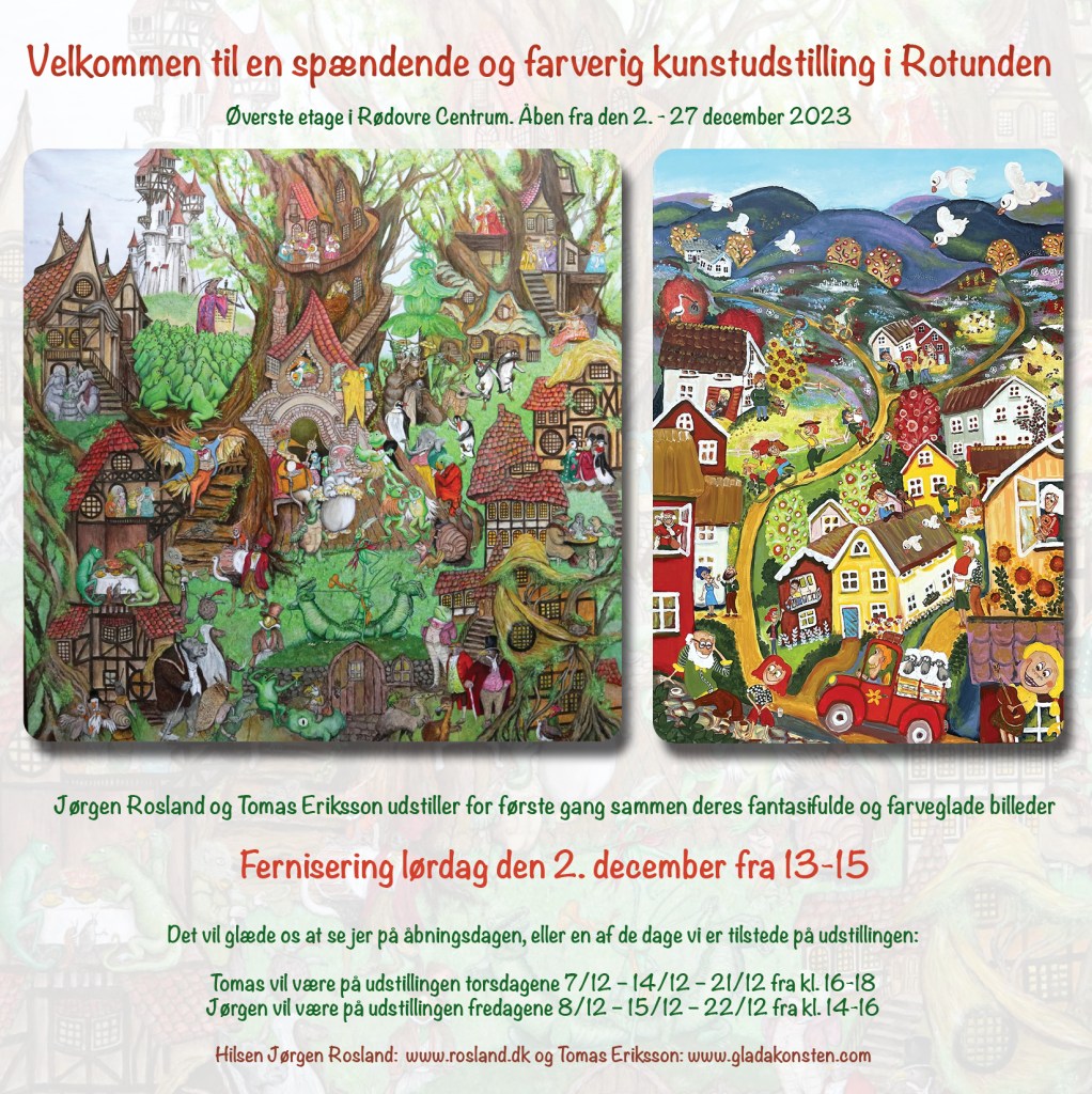 Åben galleri/værksted November 16, 2023UncategorizedDen Glada Konsten Glada Konsten holder åben galleri/værksted søn 26 nov kl 11-15. Velkommen til vores værksted og galleri for naiv kunst. Tomas maler store farverige glade billeder og Lotte laver det samme, men nu oftest tredimensionelt i ler. Alle velkomne!